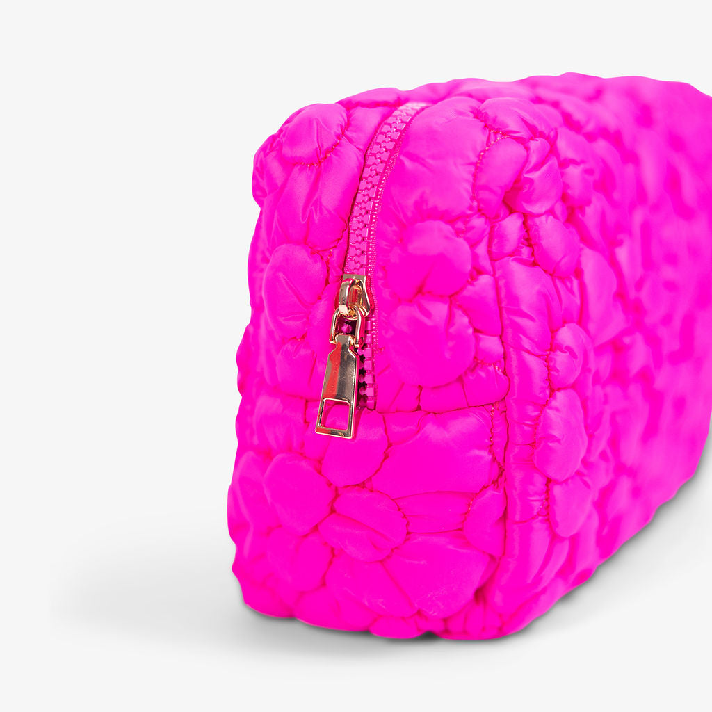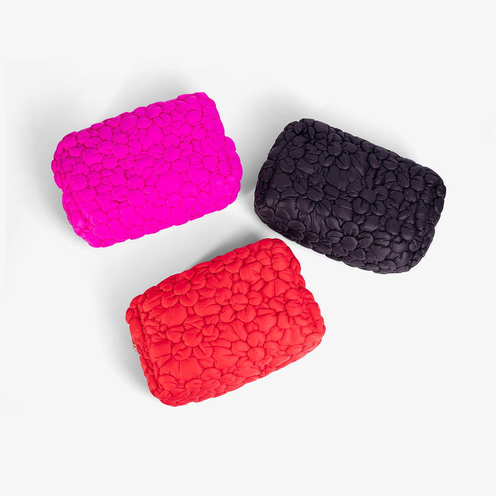 The Flora Pop Cosmetic Bag effortlessly blends style and practicality, bringing elegant organization to your beauty routine. Featuring a unique quilted floral design with luxurious gold hardware, this spacious yet compact bag is perfect for storing makeup, toiletries, and small essentials.